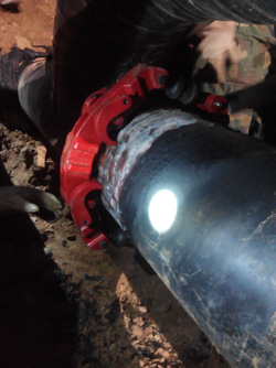 當(dāng)晚,從晚上18點(diǎn)開(kāi)挖作業(yè)坑,由煤氣公司管線所負(fù)責(zé)人籍所長(zhǎng)現(xiàn)場(chǎng)指導(dǎo)工作,直至凌晨一點(diǎn),閥井全部挖開(kāi)??蛻舨捎秒p向供氣模式,臨時(shí)關(guān)閉需更換閥門(mén)兩端的閥門(mén),打開(kāi)放散空放散管道余氣,去除陳舊閥門(mén)螺帽和螺栓,處理管道表面PE防腐層,切割前準(zhǔn)備工作做好后,搶險(xiǎn)隊(duì)同志們按照步驟安裝我司旋轉(zhuǎn)式切管機(jī)ECR12,進(jìn)刀、旋轉(zhuǎn)、不停進(jìn)刀,不到二十分鐘時(shí)間把DN300鋼管順利切斷,整個(gè)切割過(guò)程實(shí)現(xiàn)了無(wú)火花,斷口筆直、無(wú)碎屑,更省力,使切開(kāi)后的管道余氣自然排放,避免了動(dòng)火切割帶來(lái)的潛在危險(xiǎn)。 隨后,搶維修隊(duì)的隊(duì)員們按照計(jì)劃更換閥門(mén),直至凌晨六點(diǎn)鐘搶維修工作才圓滿結(jié)束。事后,晉中煤氣公司管線所長(zhǎng)及搶維修隊(duì)對(duì)我司管道冷切割工具給予很高評(píng)價(jià),同時(shí),能為幫助客戶解決問(wèn)題,我們感到尤為的榮幸,這標(biāo)志著我司產(chǎn)品質(zhì)量受到客戶的認(rèn)可與肯定!