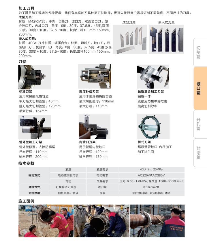 ◎ 可調(diào)節(jié)切割機構(gòu):自主研發(fā)的可以隨著管道的大小和壁厚不同來調(diào)節(jié)不同的進刀量,已達到現(xiàn)場切割效果,使得該產(chǎn)品的加工領(lǐng)域更廣泛。